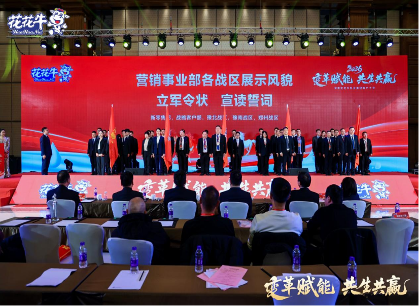 歲末寒冬,暖意融融,河南花花牛乳業(yè)集團(tuán)2026年度客戶(hù)大會(huì)盛大召開(kāi),集團(tuán)領(lǐng)導(dǎo)班子,核心經(jīng)銷(xiāo)商、配送商伙伴,外部行業(yè)專(zhuān)家,營(yíng)銷(xiāo)事業(yè)部戰(zhàn)區(qū)負(fù)責(zé)人、業(yè)務(wù)代表及相關(guān)部門(mén)人員等430余人齊聚一堂,共商發(fā)展大計(jì)。會(huì)議系統(tǒng)回顧了2025年度河南花花牛乳業(yè)集團(tuán)的經(jīng)營(yíng)發(fā)展成果,對(duì)2026年的發(fā)展戰(zhàn)略進(jìn)行了前瞻規(guī)劃與周密部署,為集團(tuán)邁向更高質(zhì)量發(fā)展奠定了堅(jiān)實(shí)根基。會(huì)議還重磅發(fā)布輕覺(jué)五紅酸奶、“5+5”輕食瓶酸奶等戰(zhàn)略新品,以及利樂(lè)鉆草莓牛奶、“嗨!檸好”、煥新版“暢極多”等多種年度新品,以創(chuàng)新產(chǎn)品矩陣開(kāi)啟2026年度發(fā)展新篇章。